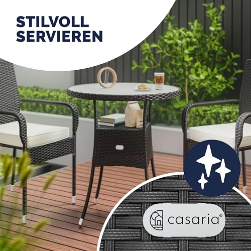 HOCHWERTIGE GARTENMÖBEL – Dieser Poly Rattan Beistelltisch von CASARIA ist für ein wohnliches Ambiente im Innen- und Aussenverhältnis sehr geeignet., MILCHGLAS TISCHPLATTE – Ausgestattet mit einer hochwertigen Glasplatte in Milchglas bietet der Tisch reichlich Platz und ist leicht zu reinigen., WEITERE ABLAGEFLÄCHE – Unterhalb der Tischplatte befindet sich eine weitere Ablagefläche. Hier finden Zeitschriften, Bücher oder Ähnliches ihren Platz. Wenn Sie die Ablage umdrehen erhalten Sie eine vertiefte Ablagemöglichkeit, dadurch können auch kleinere Teile abgelegt werden und fallen nicht herunter., WETTERFESTES POLYRATTAN – Der Tisch ist aus UV-beständigem Polyrattan – Sie werden somit lange Freude daran haben., TECHNISCHE DATEN – Maße (Ø x H): 60cm x 74cm // Material: Polyrattan & Stahl // Material Tischplatte: Sicherheitsglas (Milchglas) // Farbe: schwarz